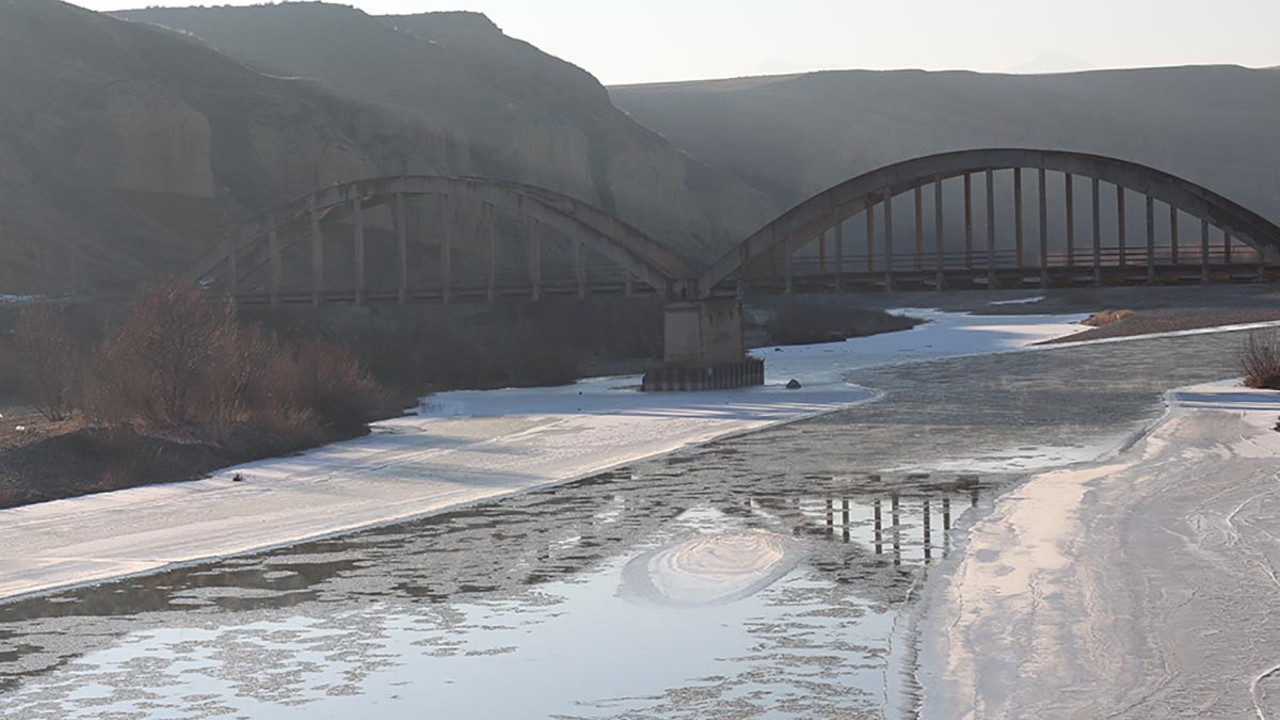 Erzurum'un Horasan ilçesinden geçen Aras Nehri'nin büyük bölümü buzla kaplandı.