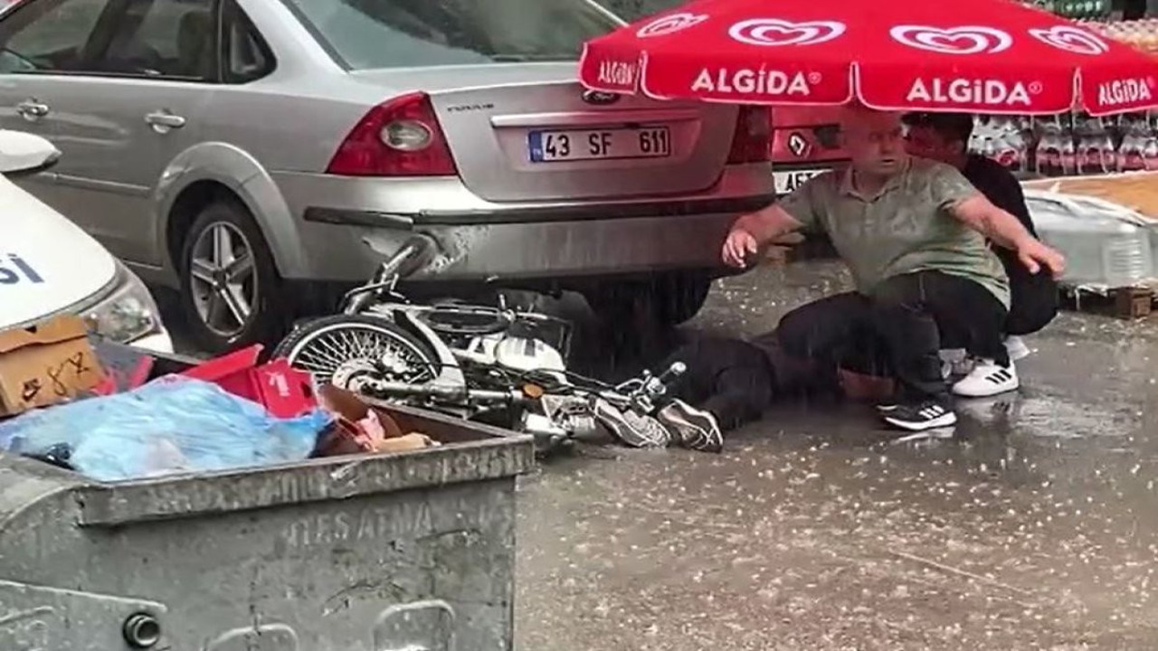 Kütahya'da, trafik kazası geçiren motosikletli kuryenin şiddetli yağışta ıslanmaması için çevredeki bir esnaf şemsiye tuttu.