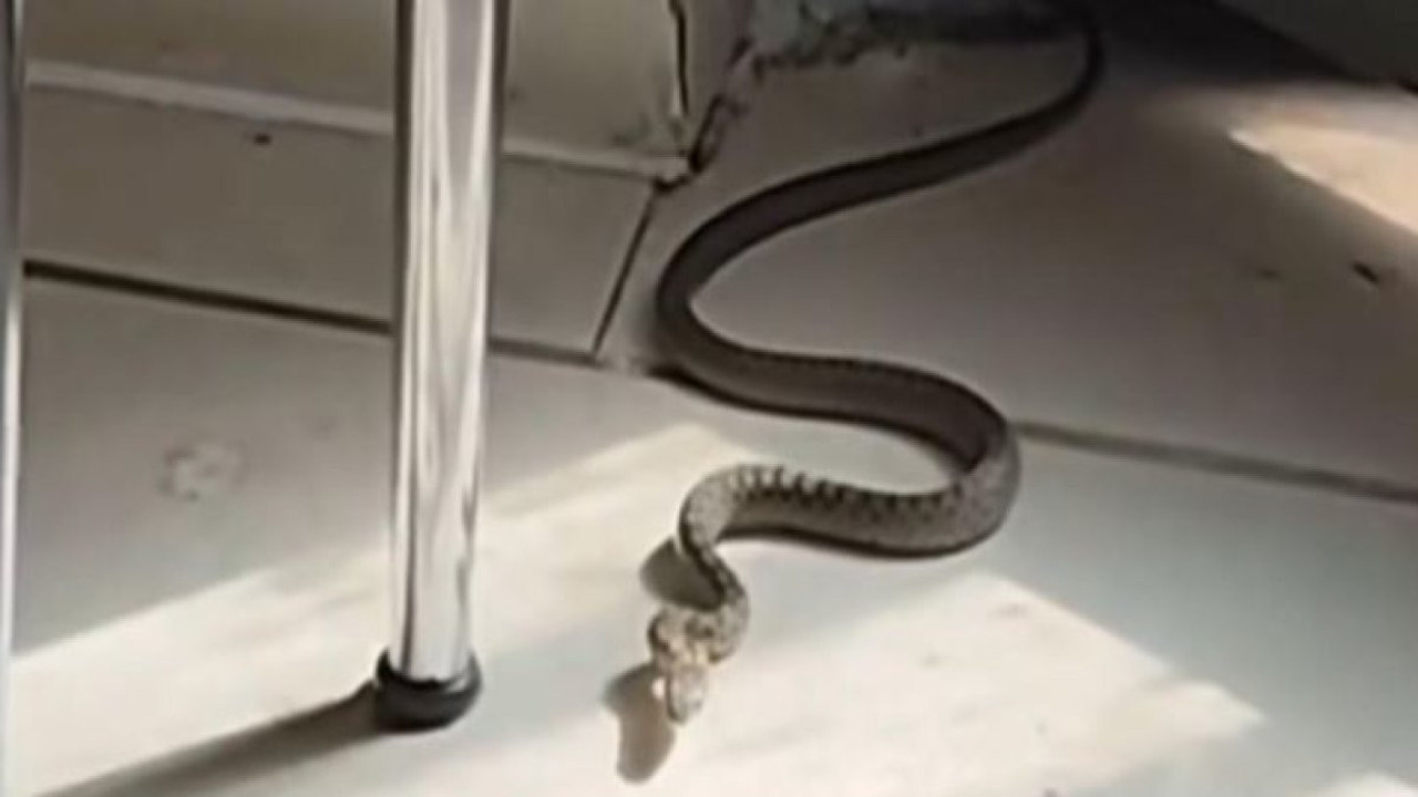 İlçenin Talaytepe Mahallesi'nde yılan, bir evin mutfak pasından içeri girdi. Yılanın süzülerek gelişini balkonda gören kedi, defalarca miyavlayarak zıpladı. O anlar, vatandaş tarafından cep telefonuyla kaydedildi.