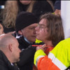 Maçın 50. dakikasında bir taraftar sahaya atladı ve kendisini plastik bir kelepçeyle boynundan kale direğine bağladı.