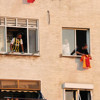 Mücadele öncesi Fenerbahçe taraftarı, üzerinde sarı-lacivertli formayi giydi, evlerinin balkon ve penceresine çıktı.