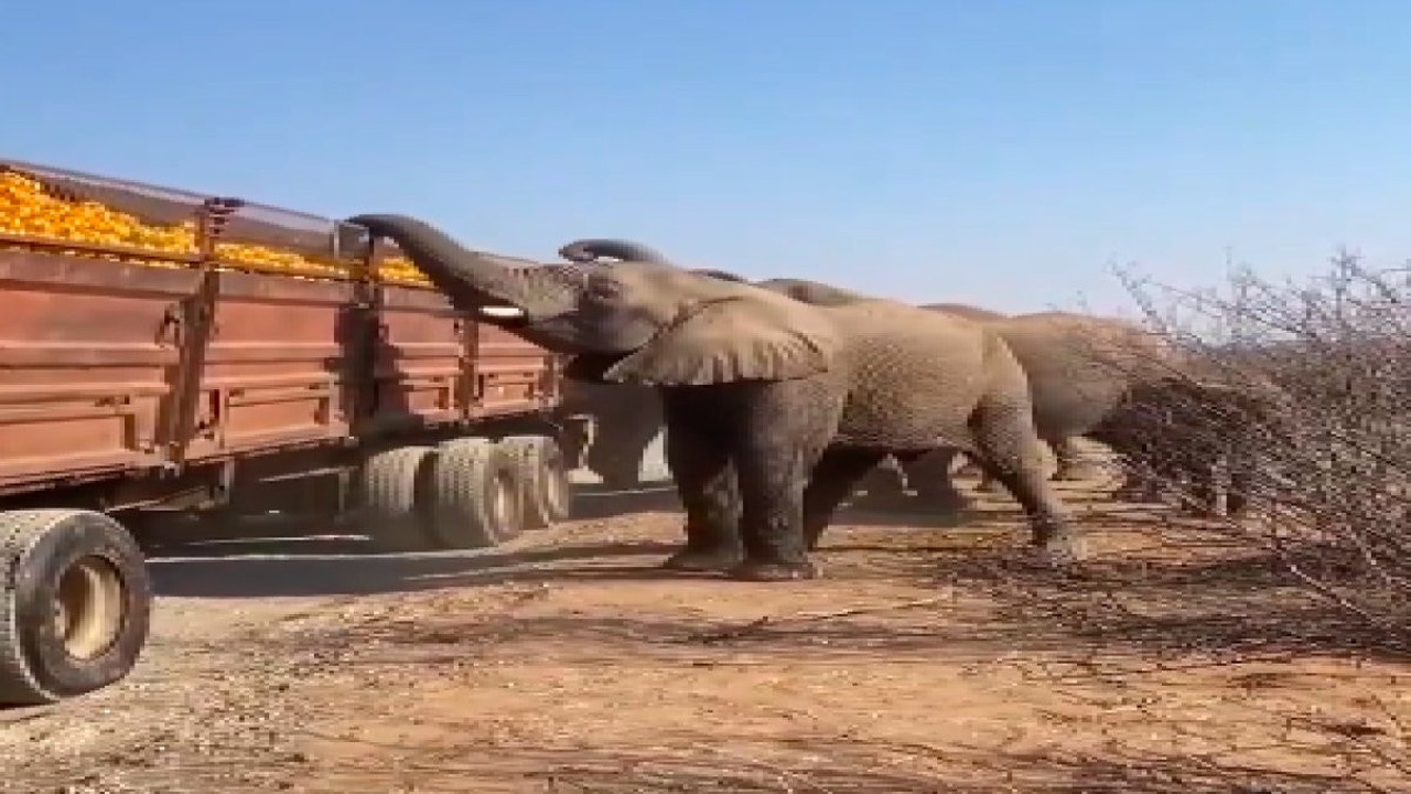 Güney Afrika'da ilginç ve eğlenceli bir olay yaşandı. Tekerleği patlayan portakal yüklü bir tır, onarım çalışmaları sırasında beklenmedik misafirler tarafından ziyaret edildi. Sürücüler tırın tekerleğini tamir etmekle meşgulken, meraklı bir fil sürüsü tırın arkasına yaklaştı.