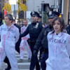 Saat 11'de üzerinde "kolonializm", "etnik temizlik" ve "faşizm" yazan tulumlar giyen protestocular, geçit töreninin kısa süreliğine durmasına sebep oldu.