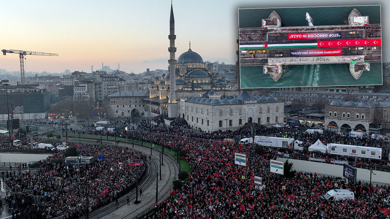 Milli İrade Platformunca, Filistin'deki katliamın durdurulması amacıyla yaklaşık 400 sivil toplum kuruluşunun iştirakiyle düzenlenen eylem için sabah namazında camilerde bir araya gelen on binlerce katılımcı, kortejle Galata Köprüsü'ne yürüyüşe başladı.