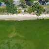 Havadan görüntülenen sahilin yeşile büründüğü ancak yanında bulunan işletmedeki vatandaşların buna aldırış etmeden denize girdikleri görüldü.