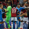 Mücadele 1-0''lık Nice üstünlüğüyle devam ederken tansiyon yükseldi. Marsilya''nın yıldızı Dimitri Payet, kendisine atılan şişeyi tribüne fırlattı. Bunun üzerine Nice taraftarları sahaya indi.