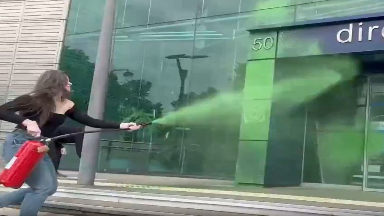 Merkezin önünde toplanan bir grup eylemci yanlarında getirdikleri sprey boyalarla binaya saldırdı. Göstericiler, boyalar bitince de tüpleri binaya fırlattı.