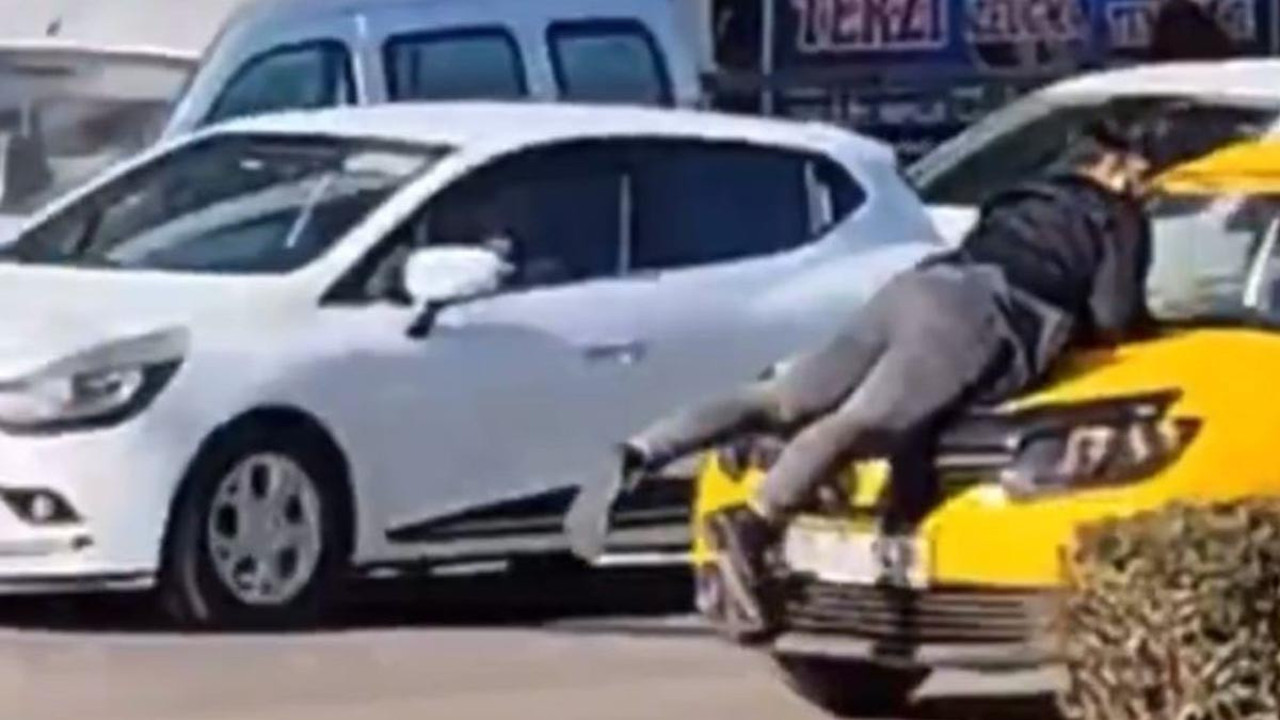 Görüntülerin devamında sürücüsü öğrenilemeyen taksinin durmasıyla araç üzerindeki şahıs kaputtan indi. Daha sonrasında ise taksi sürücüsü kaputa çıkan şahsa saldırmak isterken çevredeki vatandaşlar araya girdi.