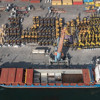 İzmir Alsancak Limanı'na dün gece demirleyen kuru yük gemisine, görevlilerce tıbbi malzemeler ve ambulanslar yükleniyor.