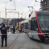 İBB ekiplerinin raydan çıkan tramvayı yerine yerleştirmeye yönelik çalışmaları sürüyor.