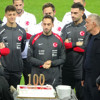 17 yıl aradan sonra Kocaeli'ye verilen resmi maç öncesi yeşil zemine ayak basan milli futbolcular sürpriz bir kutlama da yaptı. Takım kaptanı Hakan Çalhanoğlu'nun 100. milli maçı için sahanın ortasına pasta getirildi.