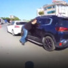 Sürücünün "Gebertirim seni" tehditlerinin ardından cipten inen sürücü "hamile eşimin yanında bana saldırırsın ha..." diyerek karşılık verdi. İkilinin tekmeli yumruklu kavgasını hamile eş çığlık atarak durdurmaya çalıştı. O anda kavgaya engel olmaya çalışan motosiklet sürücüsü ise, "Polis var devam et ağabey. Yapmayın, yapmayın ehliyetiniz gidecek" şeklinde uyarılarda bulundu. Çevredekiler araya girerek kavgaya müdahale etti. Kavga, otomobil sürücüsünün aracına binerek uzaklaşmasıyla sona erdi. O anlar motosiklet sürücüsünün kask kamerasına yansıdı.