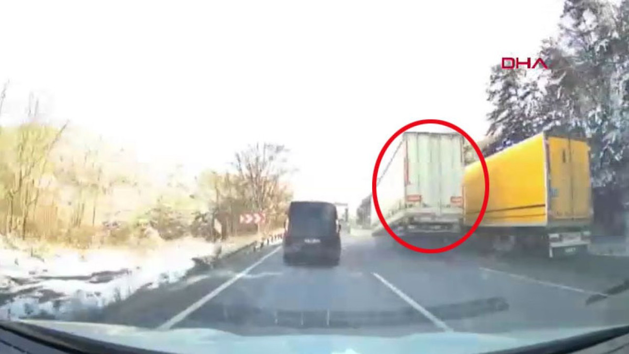 Olay, saat 15.40 sularında Bursa- Ankara karayolu Ümitalan rampasında gerçekleşti. Bursa'dan İnegöl'e hareket eden sürücüsü ve plakası öğrenilemeyen TIR'ın yokuş çıktığı sırada dorsesi bir anda kupadan koparak, yol ortasında indi. Seyir halindeki TIR'ın ön kısmı yolun yaklaşık 100 metre ilerisinde ancak durabildi. Olayda herhangi bir kaza meydana gelmezken, sürücülerin saniyelerle kurtulduğu o anlar bir aracın kamerasına yansıdı.