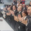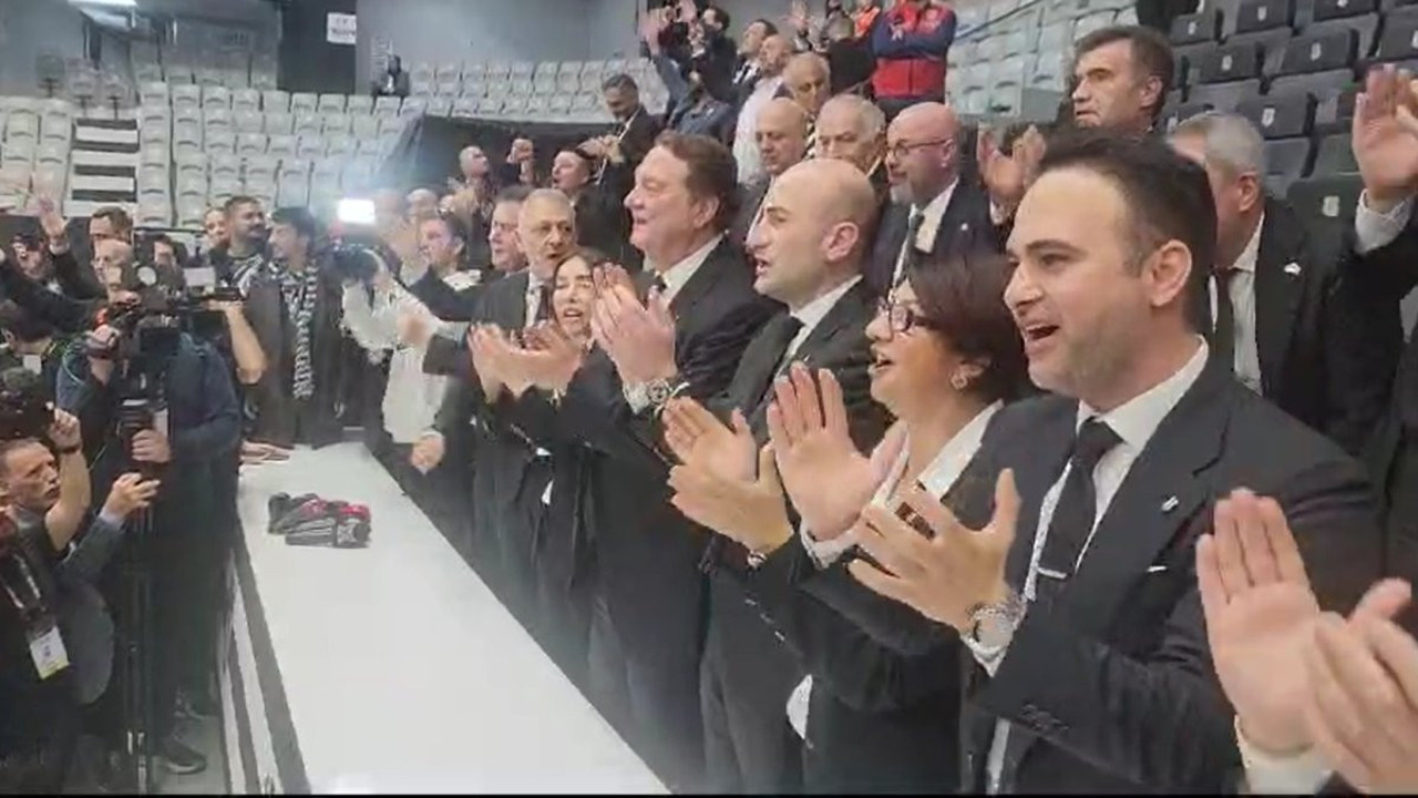 Yönetim kurulu üyelerini yanına alıp toplu fotoğraf çektiren Hasan Arat o sırada çalınan Beşiktaş marşlarıyla salonu adeta inletti.