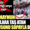 Maymunlardan biri ise kendilerini izleyen ziyaretçilere taş atmaya başladı.
