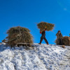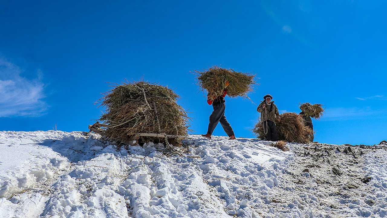 Hayvanları için biriktirdikleri otları karlı zirvelerden bakın nasıl indiriyorlar