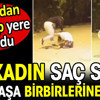 Diğerinin yere düşmesini fırsat bilen kadın, saçlarından çekerek tekme atmaya başlarken, yaşanan o anlar bir vatandaşın cep telefonu kamerasına saniye saniye yansıdı.