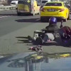 Görüntülerde, motosiklet sürücüsünün yanındaki aracın aynasını kırması ve ardından kaçmaya çalışması yer alıyor. Ancak kaçmaya çalışırken motosiklet, önündeki taksiye çarpıyor ve takla atarak duruyor