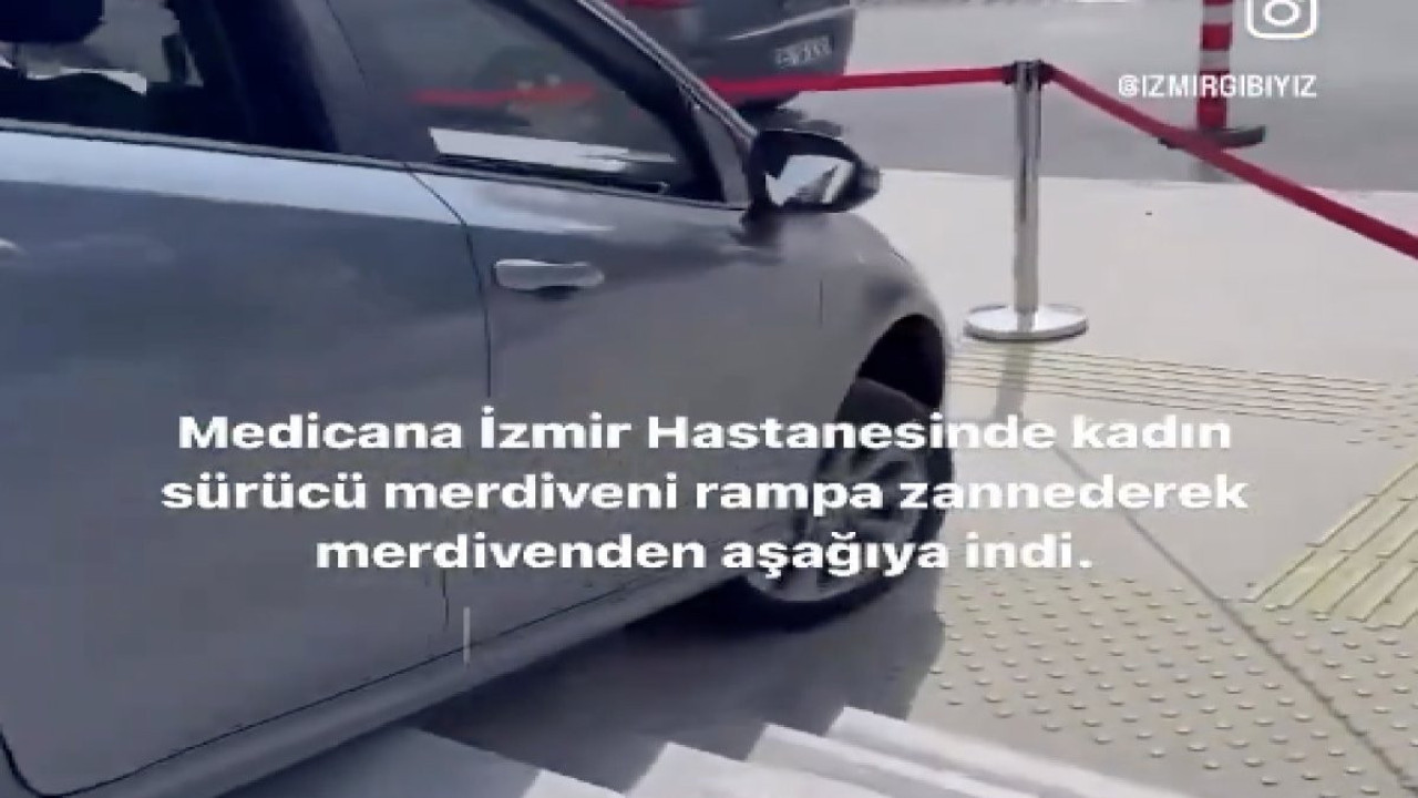 İzmir'de bulunan Medicana İzmir Hastanesi'nde dikkat çeken bir olay meydana geldi. Hastanenin girişinde bulunan merdivenleri, rampa zanneden bir kadın sürücü, aracını merdivenlere sürdü. Olay, çevrede bulunanların şaşkın bakışları arasında gerçekleşti.