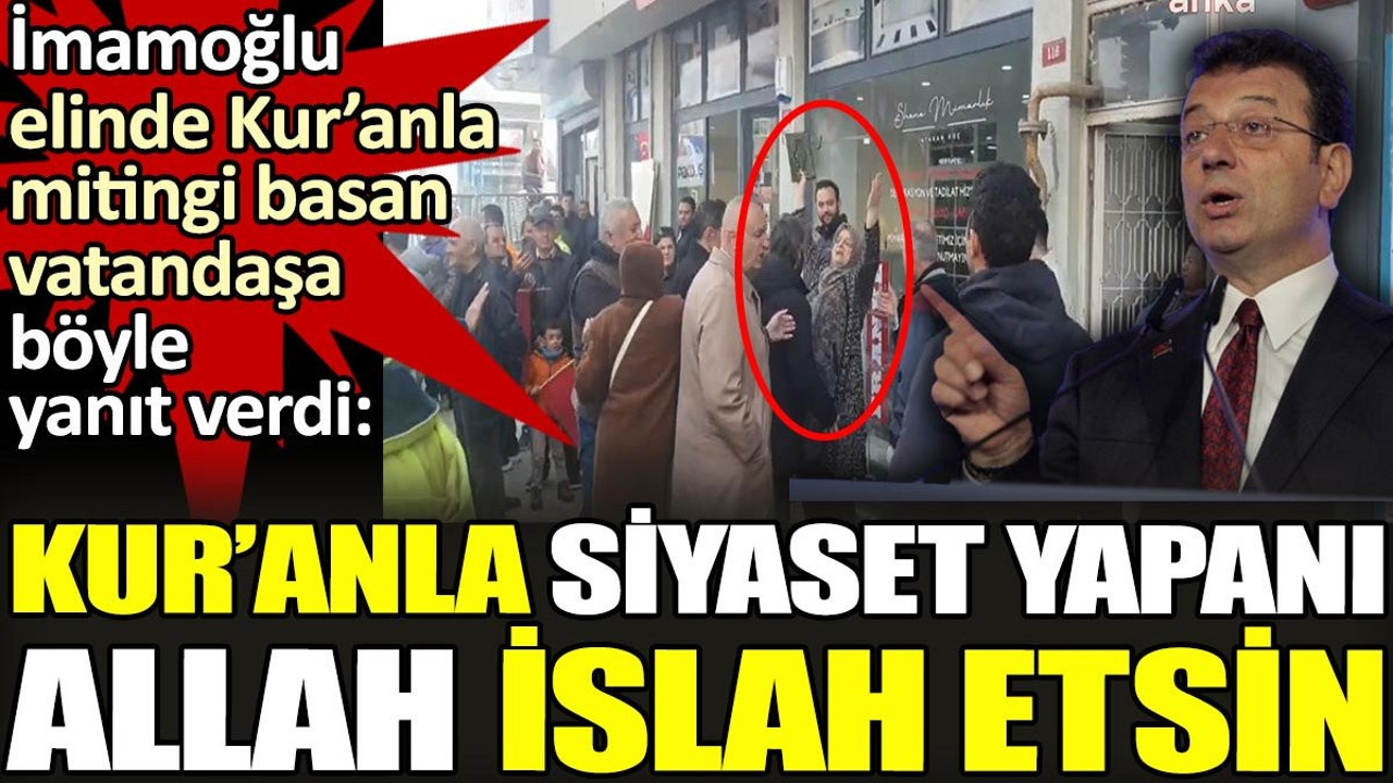 Yaşanan olay sonrası mitinge katılan vatandaşlar kuran sallayan kadına tepki gösterdi. İmamoğlu, kadına tepki gösteren kalabalığı önce sakinliğe davet etti ardından şunları söyledi, "Bana hediye etmek istersen alırım Kur'an’ı Kerim’i senden. Sakin olun sakin ablamız aldanmış bir ablamız. Elinde Yüce Kur'an ile iftira atmak günahların en büyüğü. Belli ki aldatılmış bir ablamız. Biz onları da kurtaracağız. Eline Kur'an-ı Kerim alıp siyaset yapanları Allah ıslah etsin”