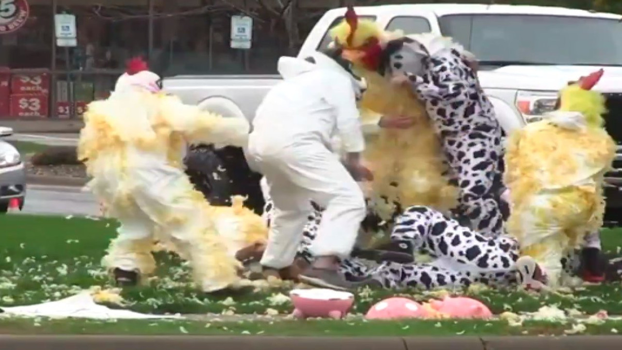 Bir grup insanın, inek ve tavuk maskotları kılığına girerek düzenlediği gösteri, önce tartışmaya ve ardından da kavgaya dönüştü. Olay, "Daha fazla tavuk yiyin" pankartı taşıyan inek maskotunun, civciv kılığındaki diğer insanların dikkatini çekmesiyle başladı.