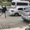 Araçtan indikten sonra sinir krizi geçiren kadın ise ara sokaktan taş alıp geri geldi. Kadın, otomobile taşla saldırmaya başladı. Dakikalarca aracın cam, kaput, aynalarına saldıran kadın otomobili paramparça etti.