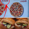 Fotoğrafta yer alan büyük boy pizzanın 530 TL, sandviçin 110 TL olduğu görülürken, kutu kolanın 63 lira olması dikkat çekti.