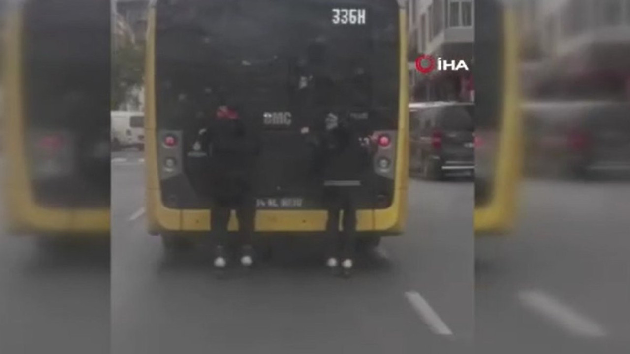 Görüntülerde, Arnavutköy ve Başakşehir ilçelerinde patenli çocukların otobüsün arkasına tutunarak trafikte ilerledikleri görüldü.