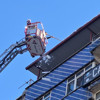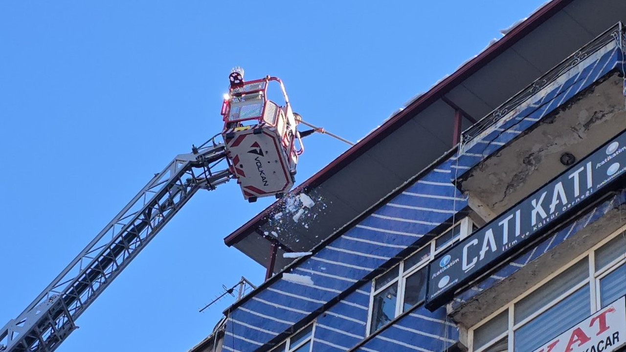 Gazi Caddesi’nde bulunan bir binaya merdivenli araçla çıkarak çatılara ulaşan ekipler, buzları kırarken, kar kütlelerini de kürek yardımı ile güvenli bir şekilde yere düşürüyor.