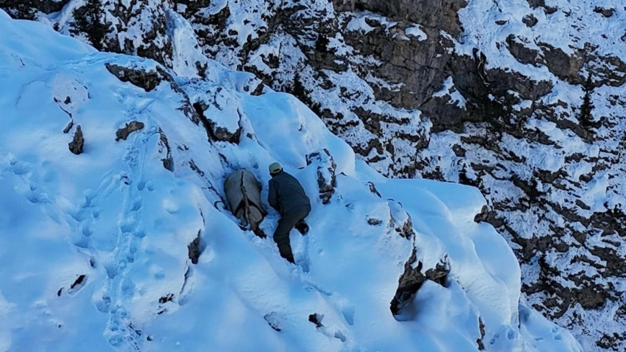 Bir süre dağ keçisinin yanında hareketsiz halde duran kişi, daha sonra karlı arazide izini kaybettirmeye çalıştı. Bu anlar havadan görüntülendi.