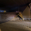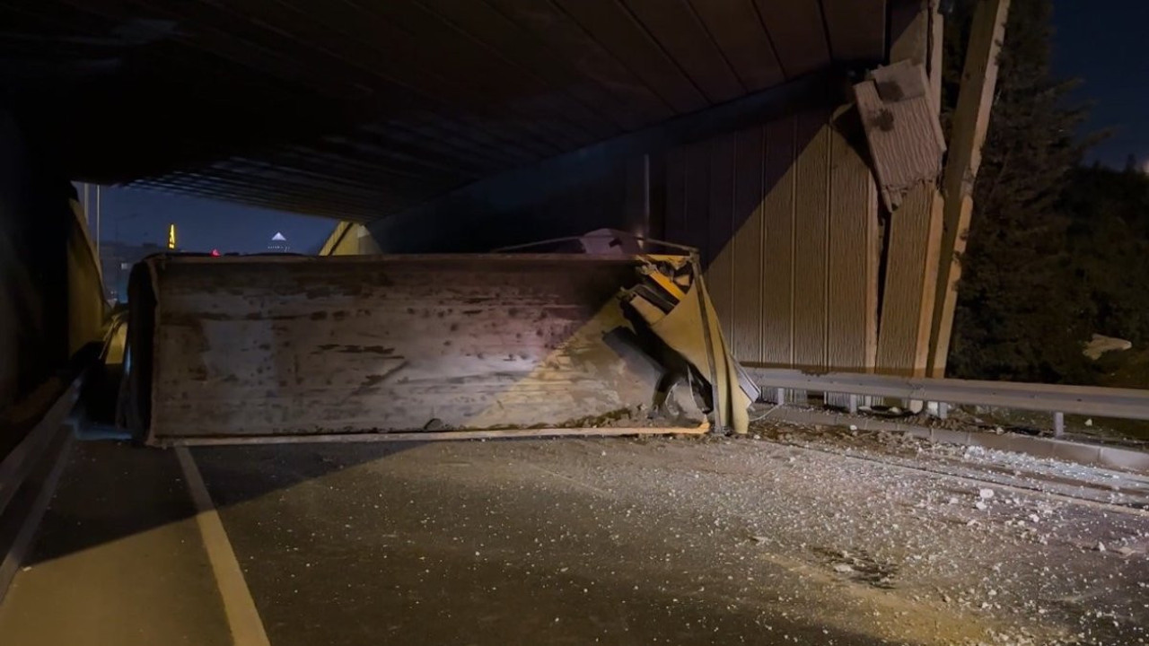 Sürücüsünün kontrolünden çıkan kamyon, köprü ve köprü ayaklarına çarptıktan sonra yan yattı.