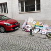 Çöplerin yanına park eden bir araçla kaldırım tamamen kapandı, vatandaşlar araç yoluna yönelmek zorunda kaldı.