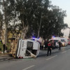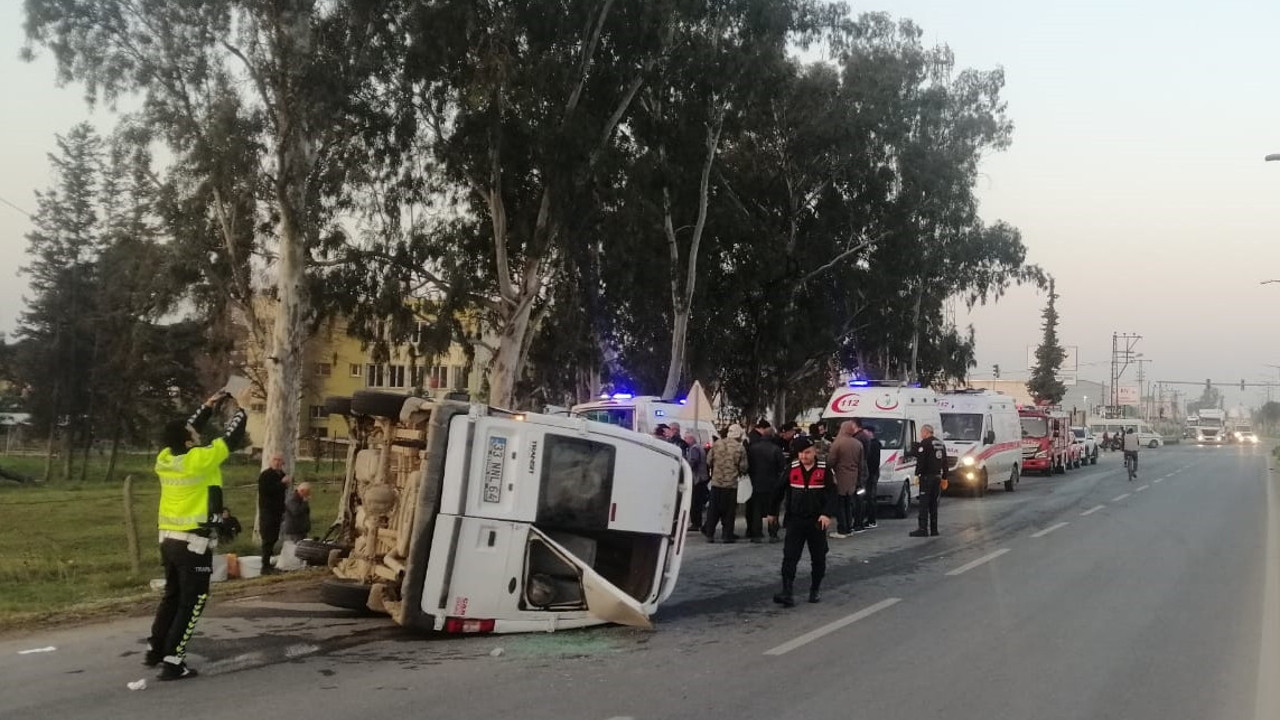 Çarpışmanın şiddetiyle devrilen minibüsteki 6 tarım işçisi yaralandı.