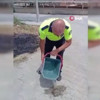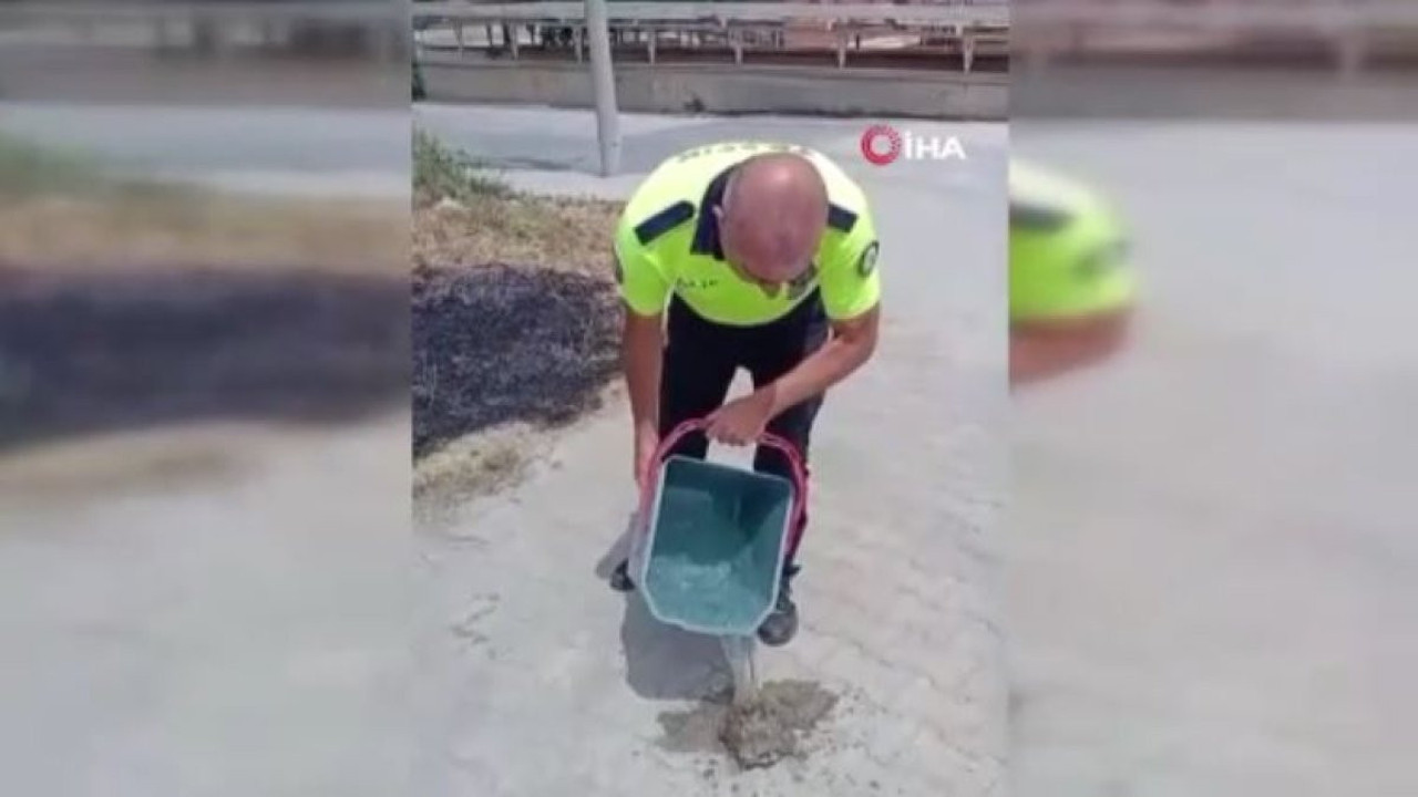 Polisler kovalarla yangını söndürürken, alevler arasında sıkışan bir kaplumbağayı gördü. Yangından kurtarılan kaplumbağayı bir polis memuru suyla serinletti.