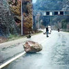 Kaya parçalarının düşmesi üzerine yolda güvenlik önlemi alan jandarma ekipleri, trafiği tek şeritten sağlıyor.