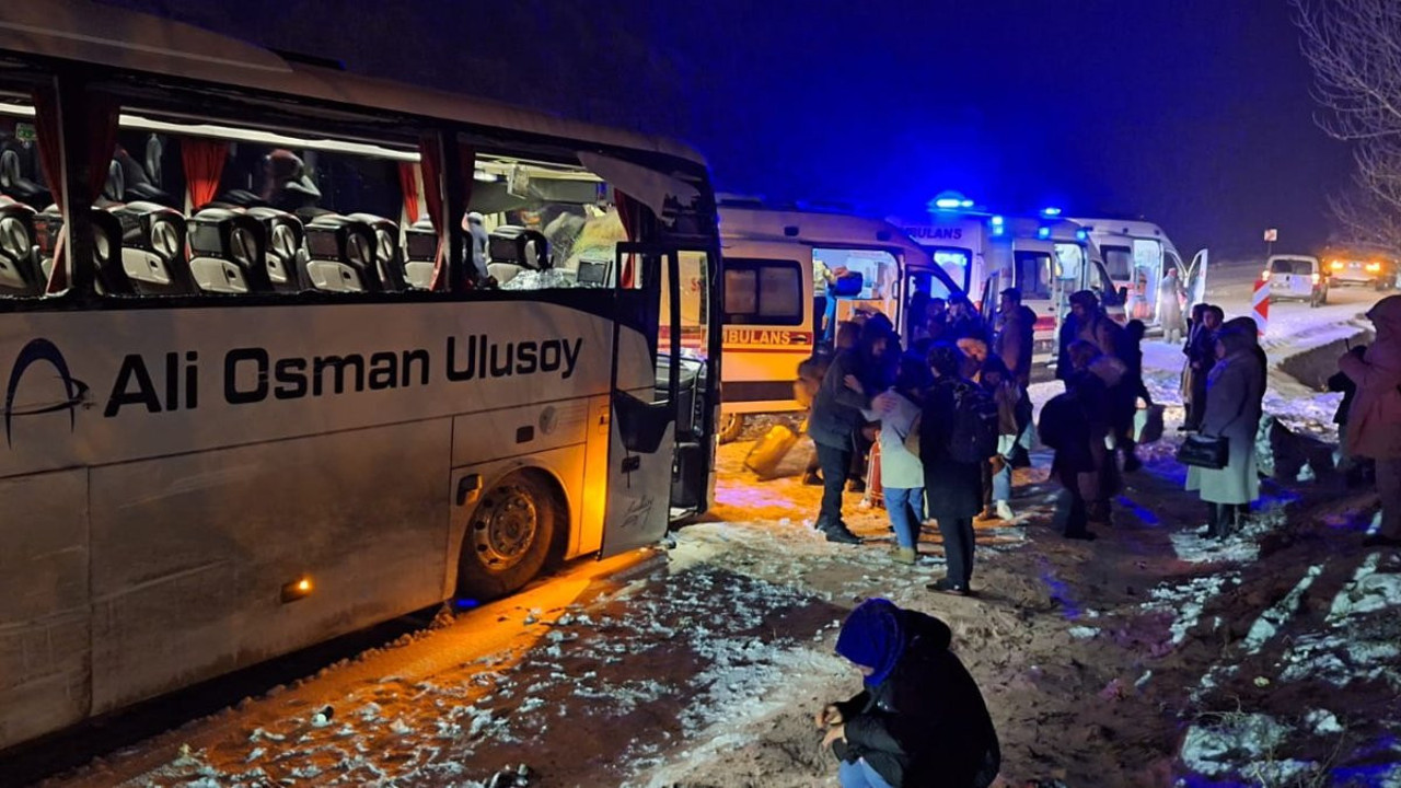 Gümüşhane’de kar yağışı nedeniyle kayganlaşan yolda kontrolden çıkarak istinat duvarına sürterek duran yolcu otobüsünde, 5’i çocuk 14 kişi yaralandı. Yaralılar hastaneye kaldırılarak tedavi altına alındı. Kazanın ardından yaşanan panik anları ise yolcular tarafından cep telefonu kamerasıyla görüntülendi.