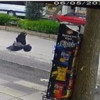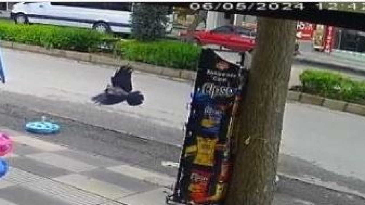 Valifahribey Caddesi'nde bir karga kent merkezindeki bir marketin önüne yerleştirilen stantta bulunan cips paketini gözüne kestirdi. Standa giren karga, cips poşetini kaldırıma attıktan sonra cips poşetini delmek istedi.