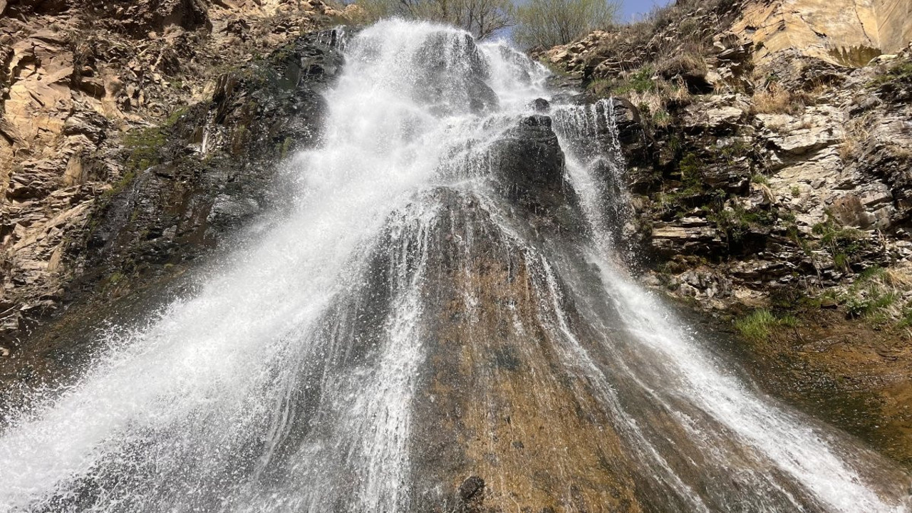 İlkbahar aylarında yoğun kar yağışının etkisiyle bembeyaz bir örtüye bürünen şelale, eriyen karlarla birlikte daha da görkemli bir akışa sahip oldu.