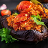 Tepsiye patlıcanların ortalarını keserek yerleştirin ve bu kesiklerden patlıcanın içine bastırarak iç malzemesine yer açın ve malzeme ile patlıcanları doldurun.