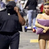 Yalnızca külotlu çorap giyen ve üstsüz dolaşan Bianca, göğüslerini bir yastıkla kapattı.