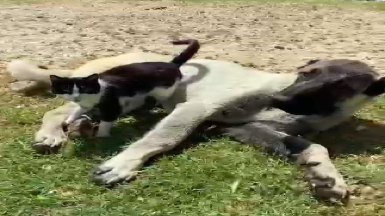 Köpeğin yanına uzanan ve onunla oynayan kedinin hareketleri, cep telefonu kamerasıyla kaydedilerek paylaşıldı. Sıcak havanın keyfini çıkararak birbirleriyle oynayan bu sevimli dostlar, izleyenlerin yüzünde tebessüm oluşturdu Bu olağanüstü dostluğun güzelliği, insanların hayvanlar arasındaki sevgi ve uyumu kutlamalarına neden oluyor.