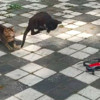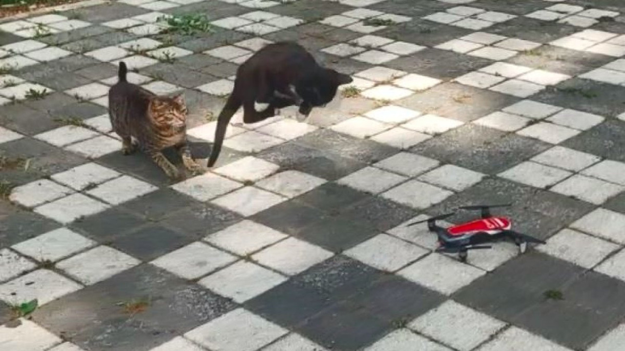 Dronu yakalayamayan kediler, sonunda cihazın yere indiğini fark ederek meraklı bakışlarla inceledi ve hatta pervanelerini çevirmeye çalıştı. Bu komik anlar, başka kameralar tarafından da kaydedildi.
