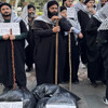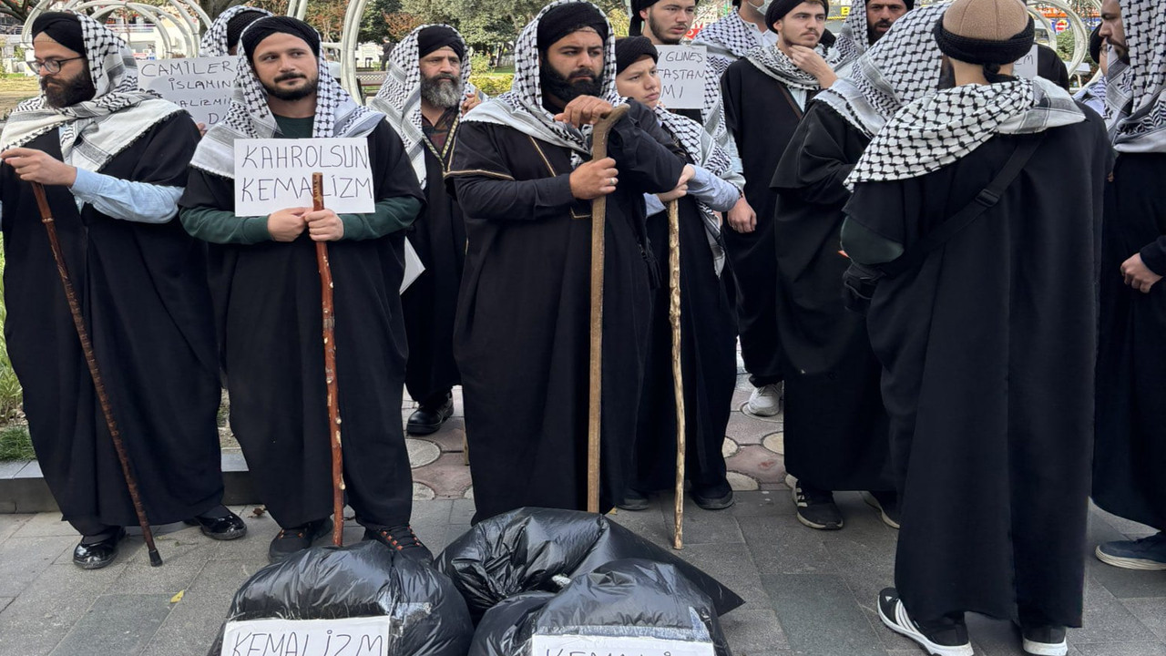 “Şeriat”a uygun giyinip önlerine üzerinde 'Kemalizm' yazan siyah çöp poşetleriyle basın açıklaması yapmaya çalışan gerici grubu, meydandan geçen yurttaşlar “Mustafa Kemal’in askerleriyiz” sloganlarıyla böldü. Kendinden emin şekilde eylem için meydana gelen gerici grubun, halkın sloganlarının ardından “açıklamalarını” apar topar sonlandırmaları dikkat çekti.