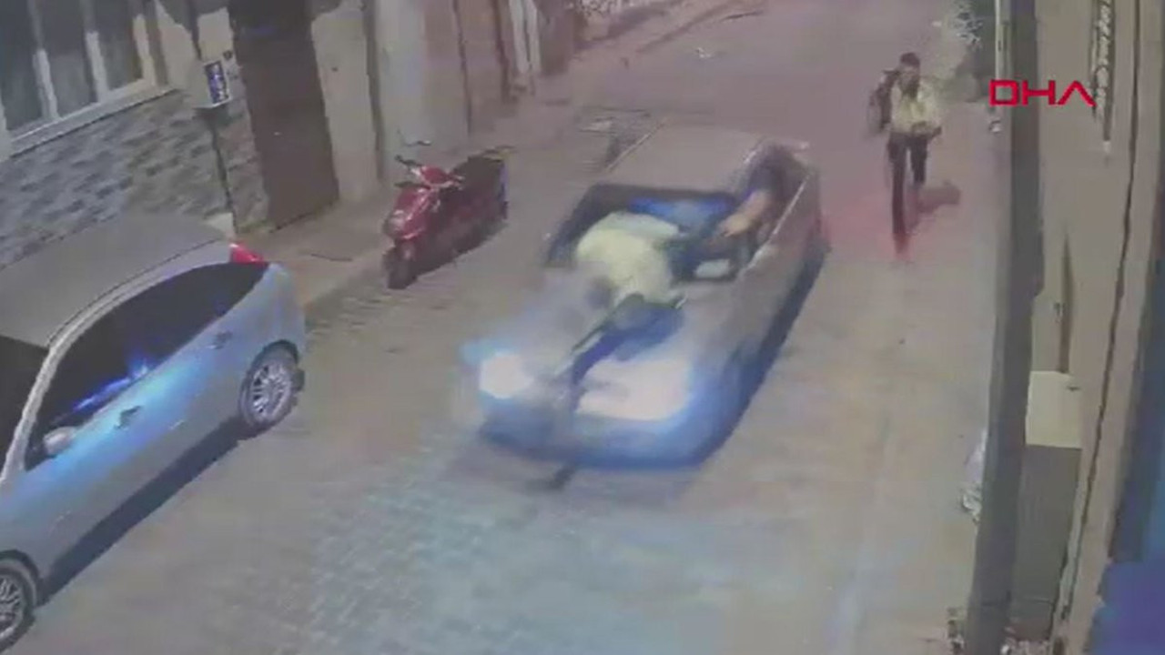 Otomobil, 4 sokak ilerde takviye ekipler tarafından önü kesilerek durduruldu. O anlar, bir binanın güvenlik kamerasına yansıdı. Görüntülerde bir başka polis memurunun da koşarak otomobili durdurmaya çalışması yer aldı.