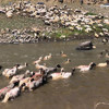 Kars'ın Akyaka ilçesi Camuşlu köyünde sürü sahipleri, kırktıkları yüzlerce küçükbaş hayvanı, yıkanıp temizlenmesi için Kars Çayı'na bıraktı. Adeta yorgunluk atan ve serin suların keyfini çıkaran koyun ve keçilerin o anları birbirinden güzel görüntüler oluşturdu.
