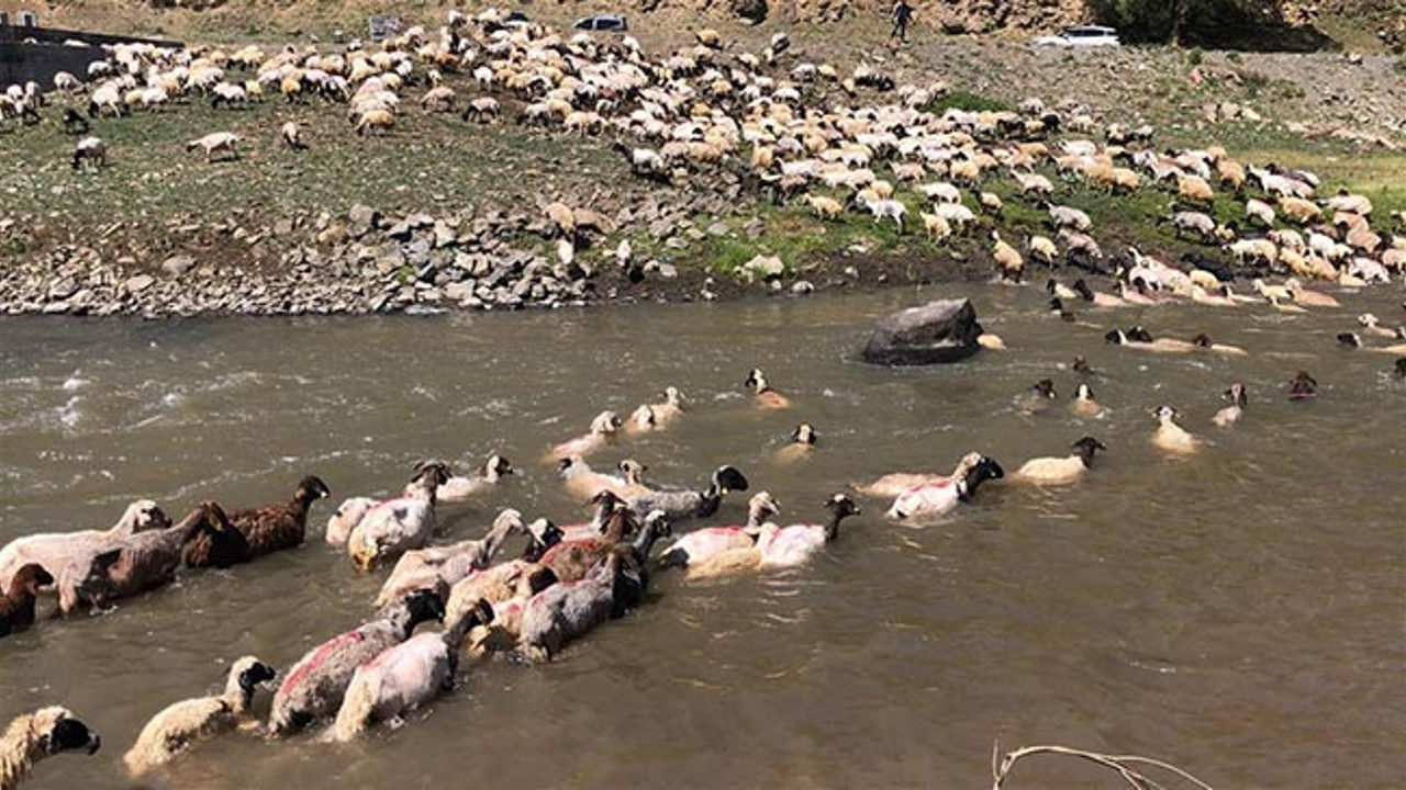 Çayın karşısına geçerken temizlenen koyun, kuzu ve keçiler daha sonra otlamaları için dağlık alana götürüldü.