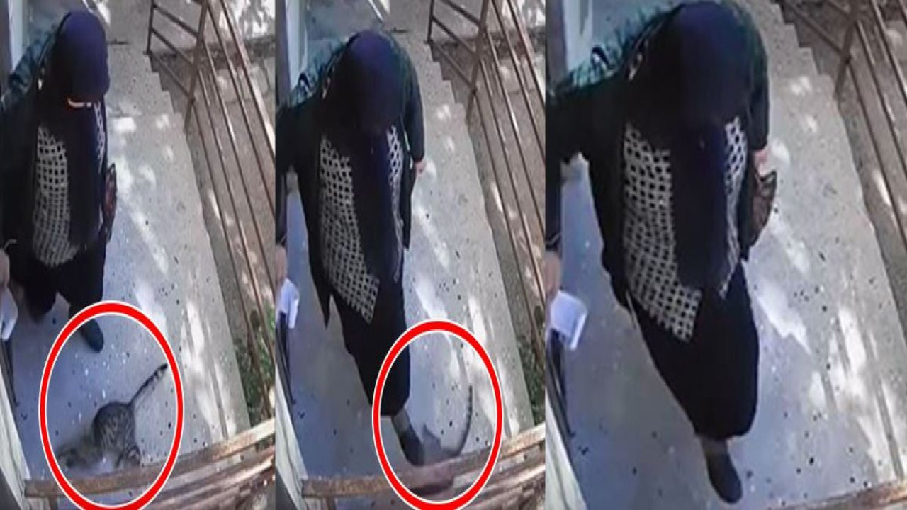 Kadının, “Sen misin merdivenlere akıtan” diyerek kediyi evin girişinin merdivenin önünde tekmelediği görüldü.