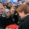 Akşener'in bu hareket karşısında duygulandığı görülürken, bayrak, seccade ve Kur'an-ı Kerim-i 3 kez öpüp başına koyduktan sonra aldığı görüldü.