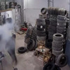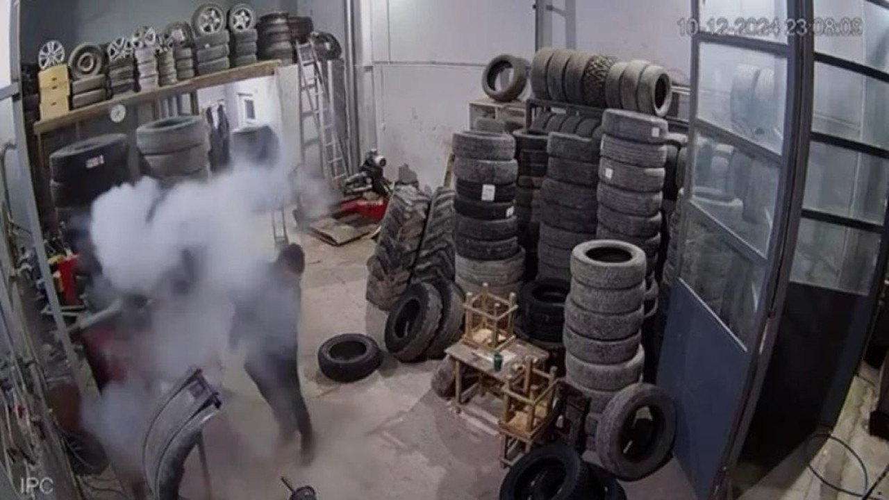 Balıkesir'de, tamircide şişirilen lastik patladı.O anlar, güvenlik kamerasına yansıdı.