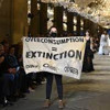 Protestocunun, moda endüstrisinin savurgan yan etkilerini vurgulamayı amaçlayan tüketim karşıtı pankartında Les Amis de la Terre, Youth For Climate France ve Extinction Rebellion France olmak üzere ikim değişikliği karşıtı üç Fransız kuruluşun logoları da yer aldı.